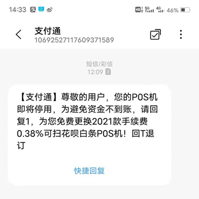 近期,很多支付通POS机用户收到如下短信内容弄,甚至还有很多收到很多条信息。短信内容大同小异,几乎都是这种套路,接到这种诈骗短信的话,不用理会就行了,千万不要回复,因为一旦回复以后,电话号码就会在骗子的短信群发后台登记,就会接到骗子的电话。