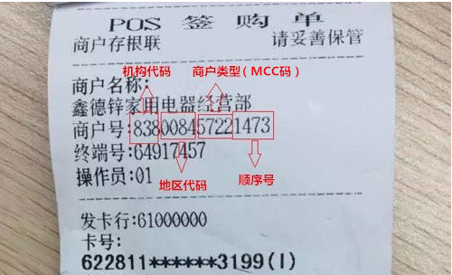 我们使用POS机进行交易的时候会打印小票,小票上有商户名称、商户编码、交易时间、交易金额、交易终端、签名等等信息,其中MCC码就在商户编码中。